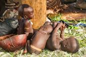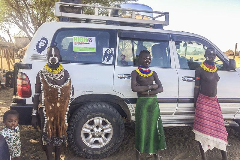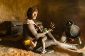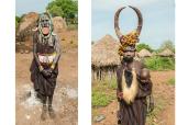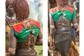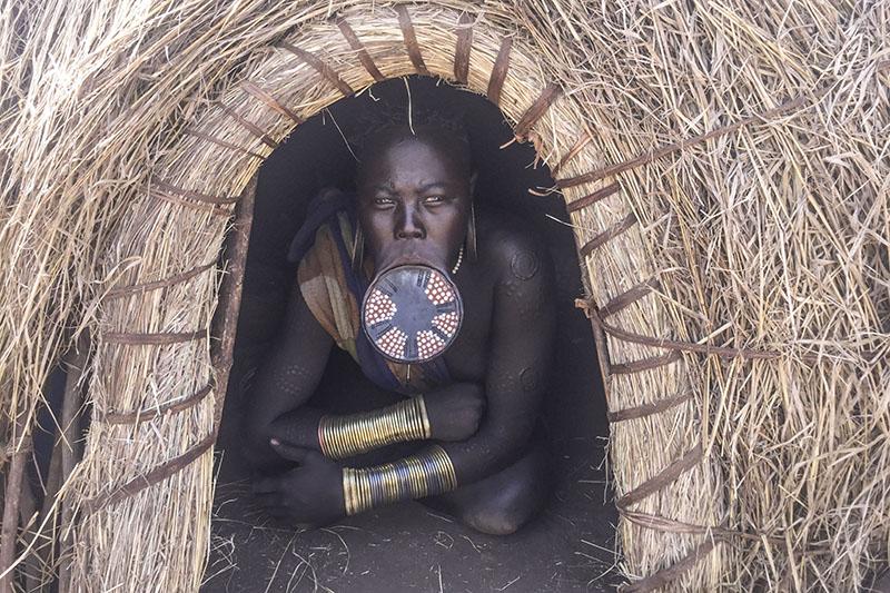 The famous admirable lip plates of the Mursi people with their body scarifications.